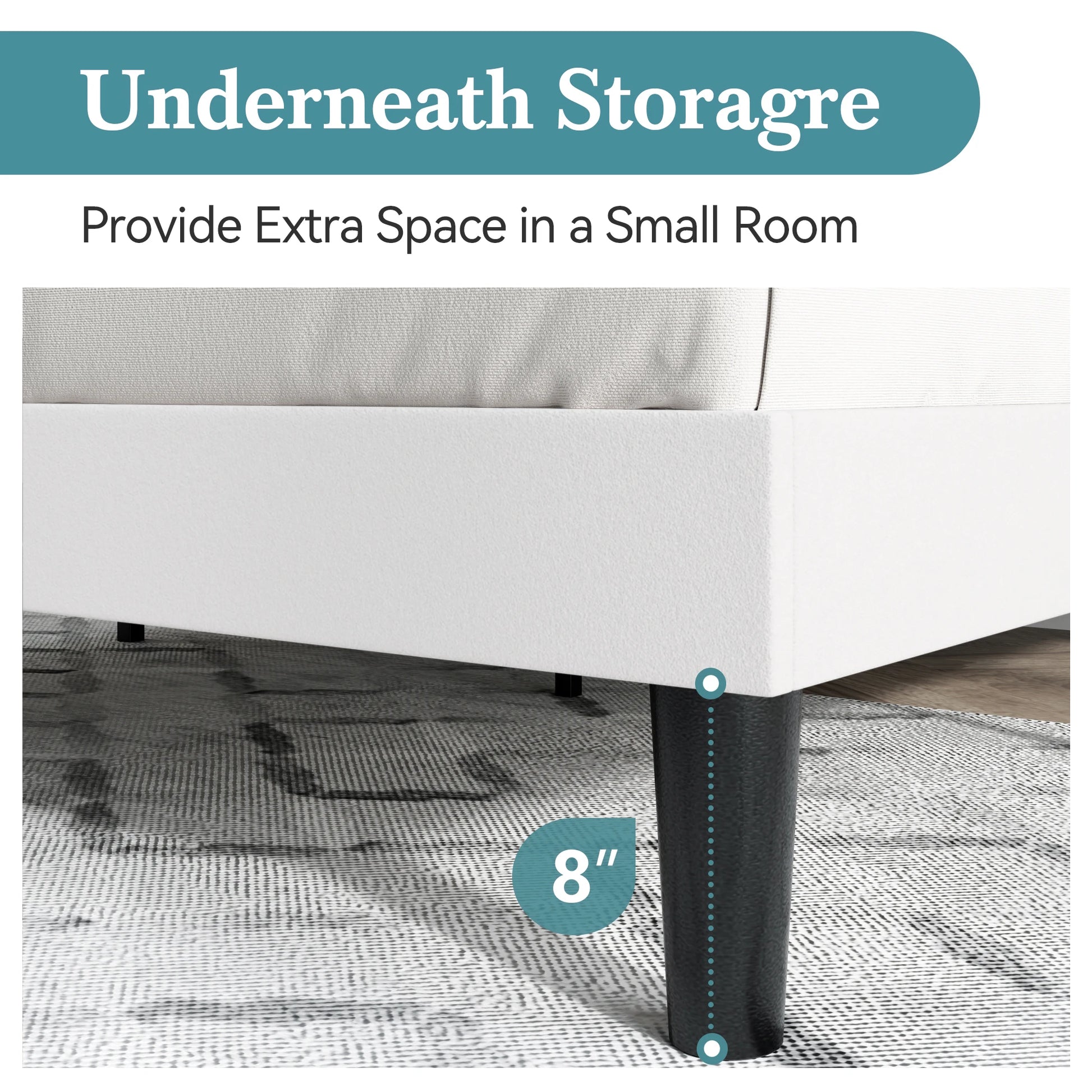 - Eight-inch under-bed clearance creates space for clothing, bedding, and seasonal items, keeping you organized and making dusting a breeze.